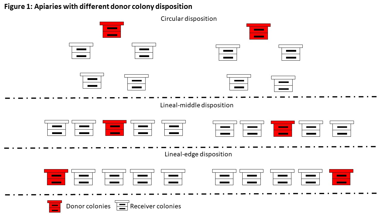 Two apiaries in a linear arrangement, each with a donor colony located at the end of the line